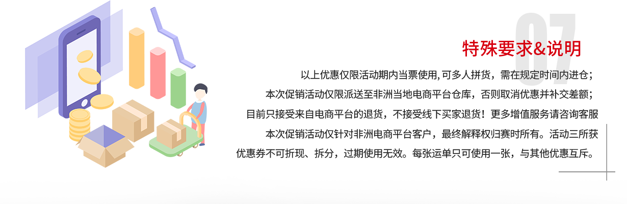 為了在即將來臨的黑色星期五和圣誕節(jié)等電商旺季中,非洲賣家能夠及時備貨補貨。賽時特別推出為跨境電商客戶量身訂制的活動方案。旺季價格不變和特快航線,可以讓賣家享受到最低的物流成本和最優(yōu)的到達速度,真正助力旺季大賣!活動時間: 2019年9月16日-2019年12月31日